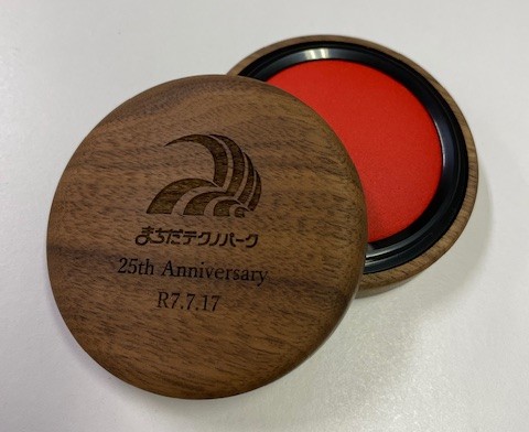 まちだテクノパークは、2025年7月17日に25周年を迎え、全社が揃って記念の食事会を開催しました。記念品は、まちだテクノパークのロゴをあしらった朱肉です。